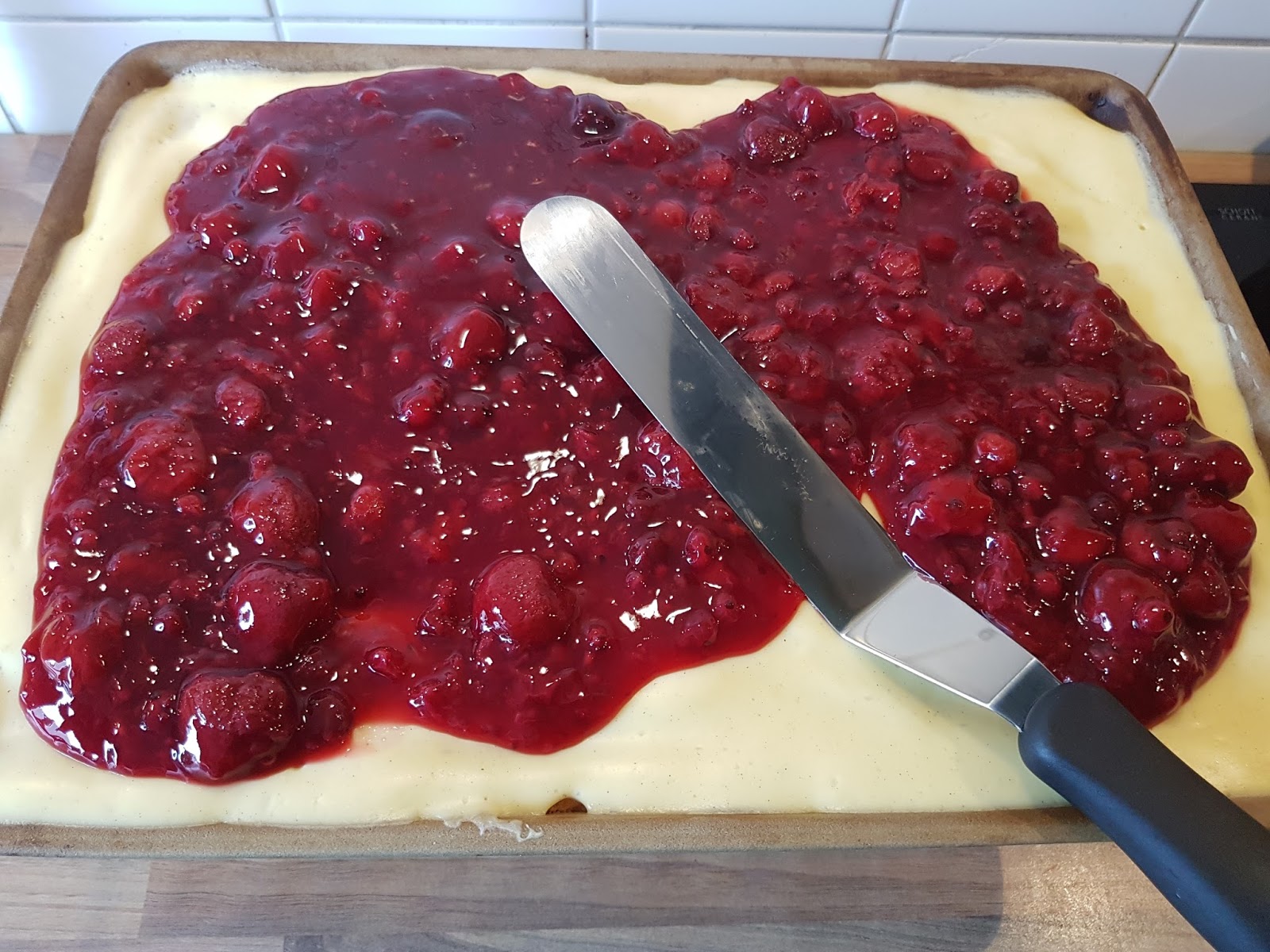 Rote gruetze auf der fuellung verteilen. In unserem rezept erklaeren wir schritt fuer schritt wie sie garantiert gelingt. Erdbeeren oder kirschen waren urspruenglich nicht enthalten. Geben sie die masse in.